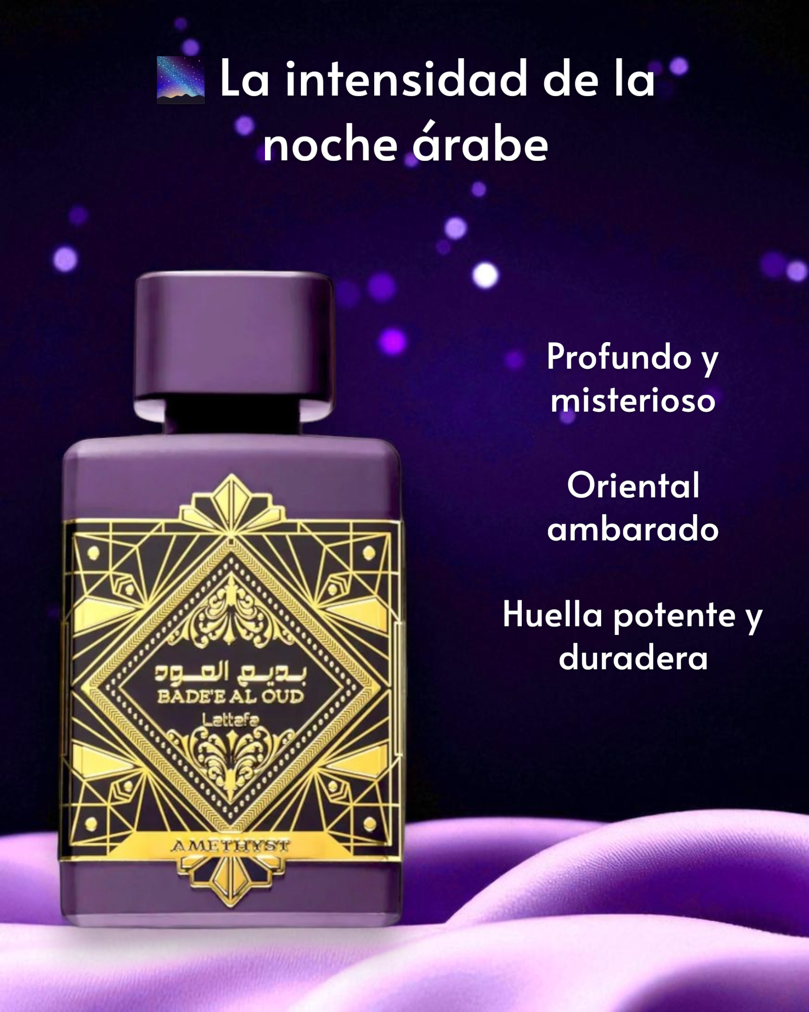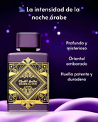 Bade'e Al Oud Amethyst de Lattafa es una fragancia oriental y floral que se abre con notas especiadas de pimienta rosa y la frescura cítrica de la bergamota. En el corazón, una rica combinación de rosas turcas y búlgaras se entrelaza con el jazmín, aportando una profundidad floral. La base está compuesta por oud (madera de agar), ámbar y vainilla, proporcionando una calidez dulce y amaderada que envuelve los sentidos.