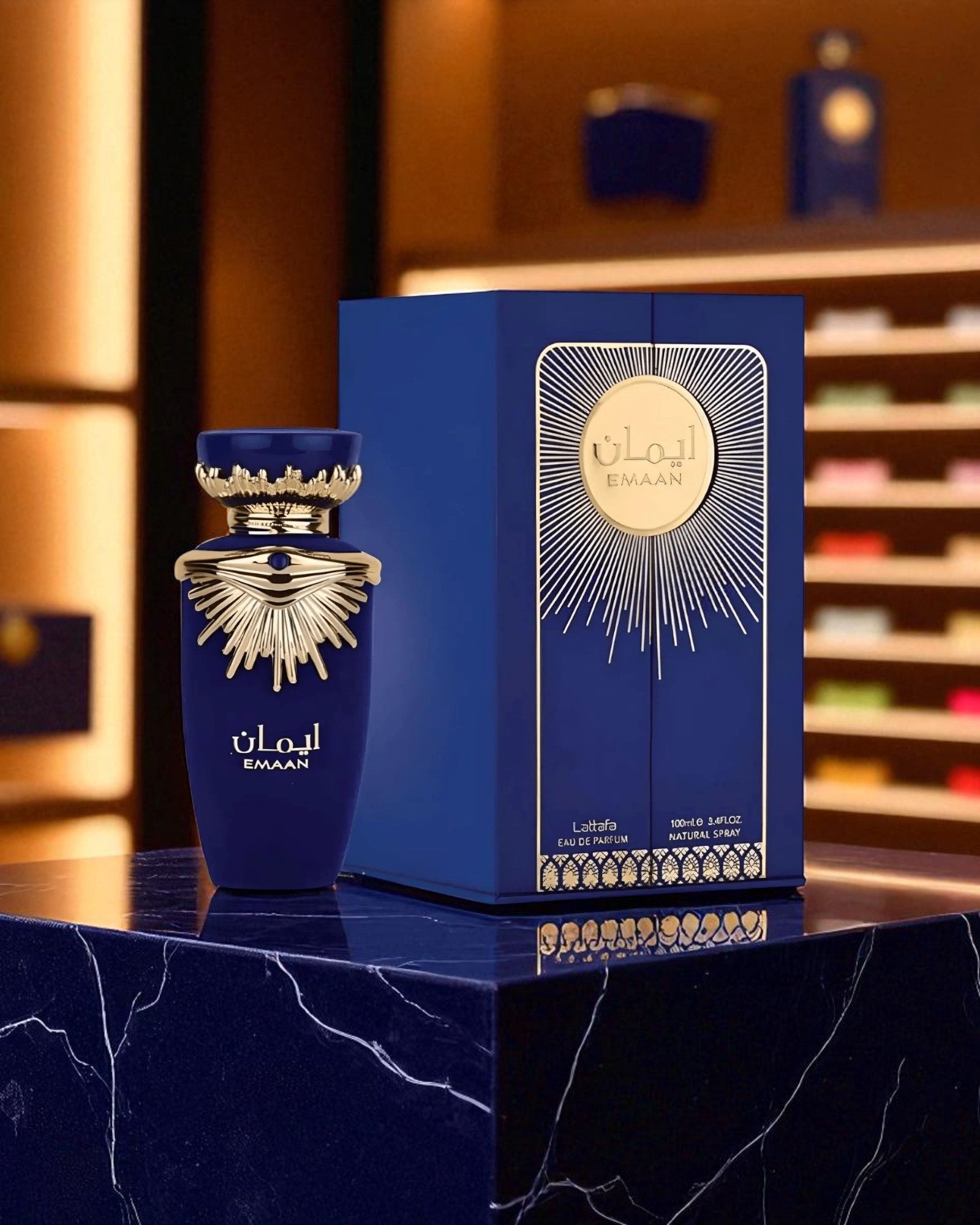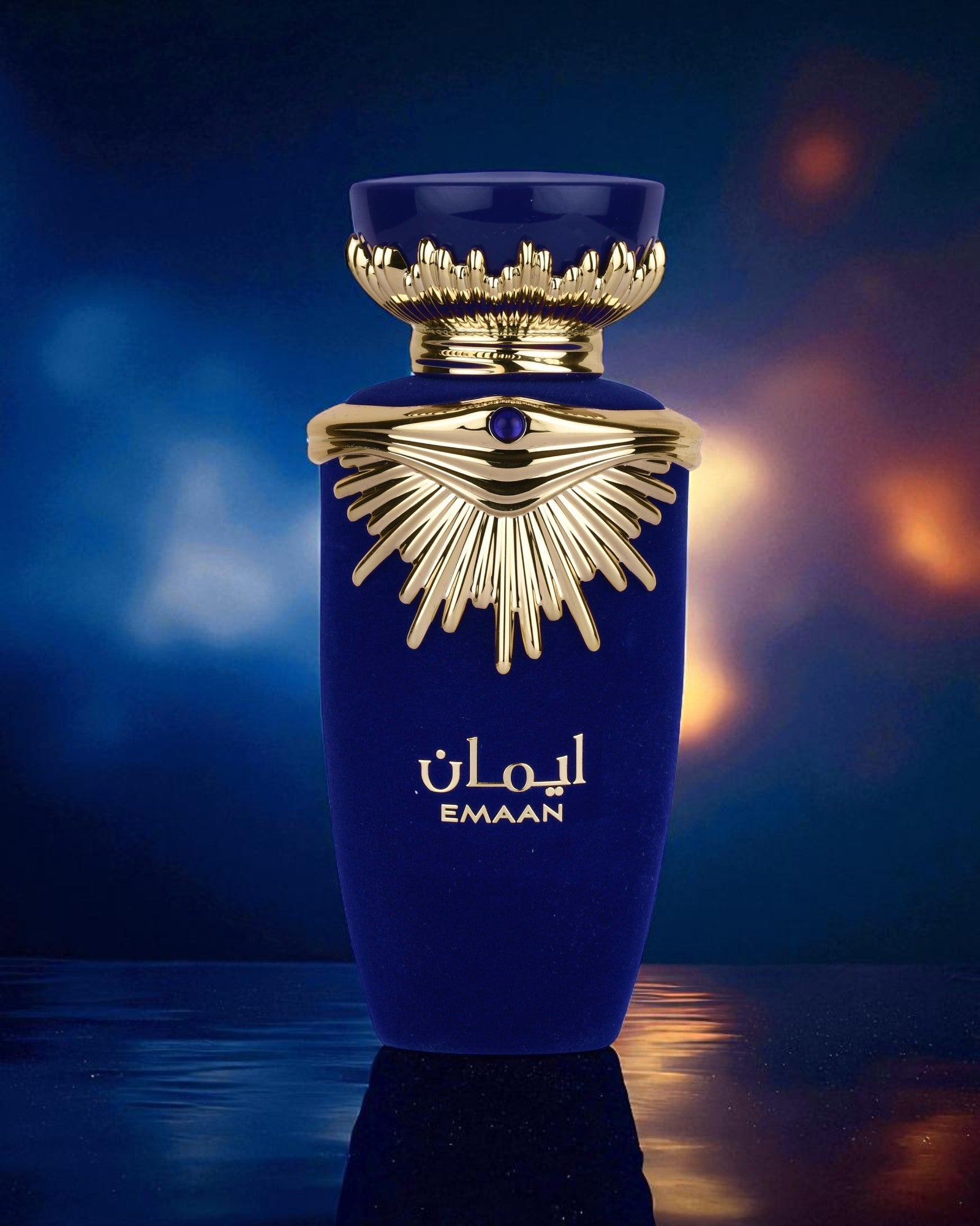 Emaan despierta con notas cítricas de bergamota, flor de azahar y grosella negra, evoluciona con tuberosa, jazmín y caléndula, y descansa sobre una base de vainilla, musgo blanco, pachulí y cedro, proyectando un bouquet floral-cremoso con elegancia femenina.