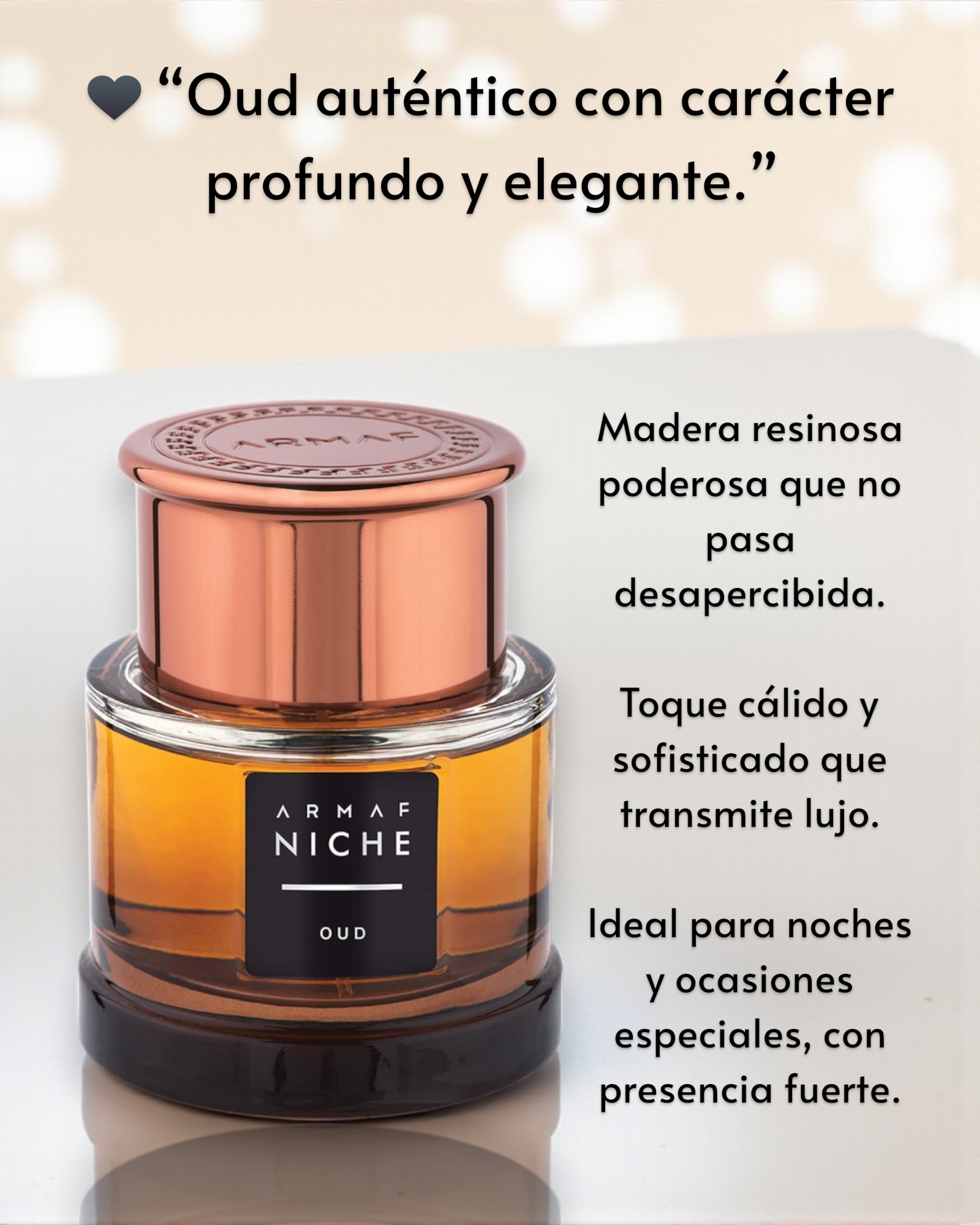 Niche Oud de Armaf es una fragancia oriental fougère que ofrece una experiencia olfativa rica y envolvente. Se abre con notas especiadas de alcaravea, salvia y bergamota, proporcionando una introducción cálida y aromática. En el corazón, la pimienta negra, el cedro y el iris aportan una mezcla amaderada y floral que añade profundidad. La base combina ámbar, vainilla, cuero y pachulí, creando una estela cálida y duradera.