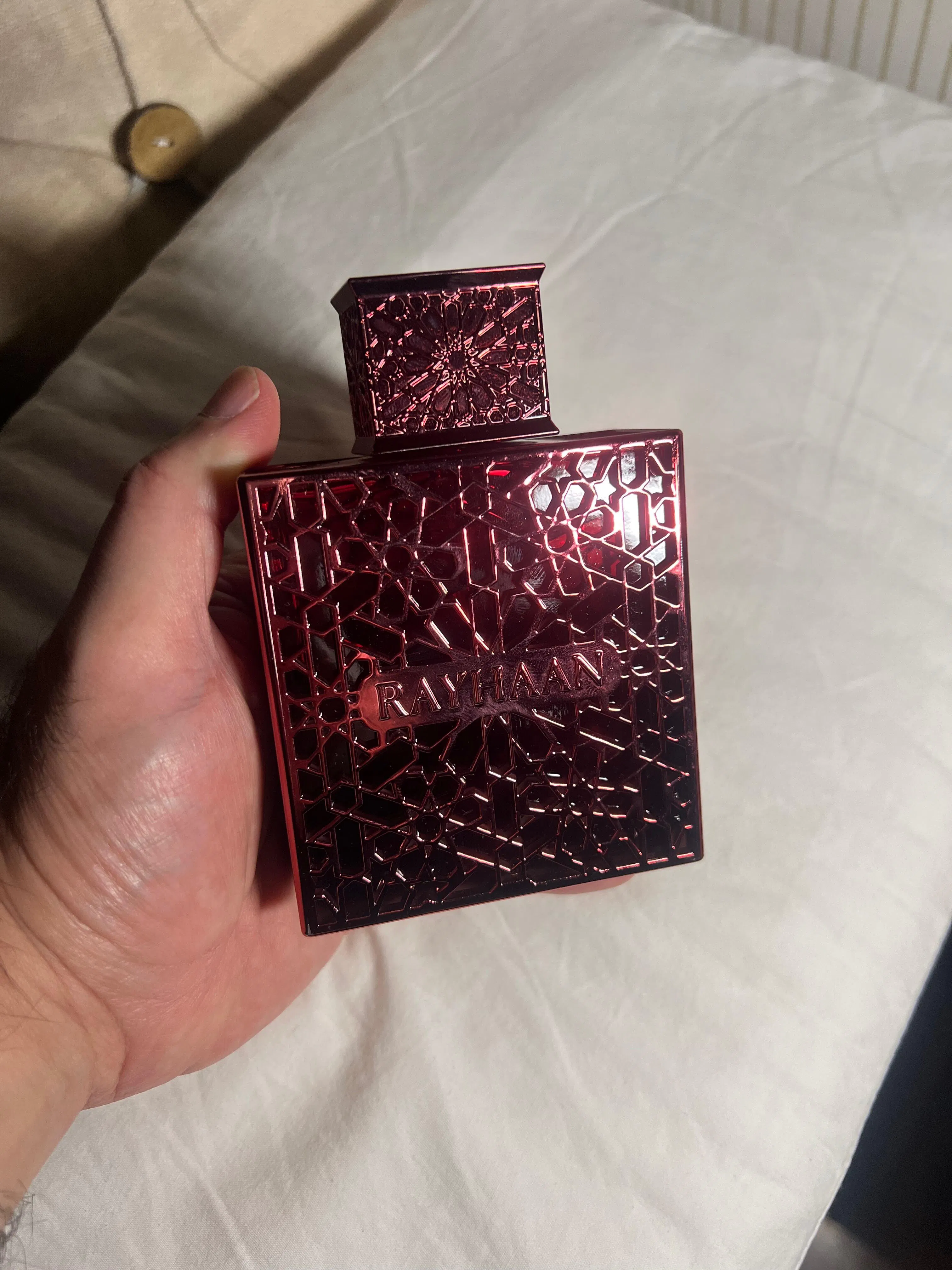 Rayhaan Crimson es una fragancia especiada, cálida y envolvente que combina fuerza, sofisticación y dulzura profunda. Desde la apertura, la canela, el cardamomo y la pimienta rosa despiertan los sentidos con intensidad y carácter. En el corazón, el pachulí (con un toque floral por heliotropo, geranio y jazmín) aporta profundidad y elegancia, equilibrando la mezcla especiada. La base de vainilla, benjuí y haba tonka deja una estela cálida, suave y sensual que persiste en la piel, convirtiendo a Crimson en un perfume adictivo y memorable perfecto para destacar con presencia y confianza en noches especiales.