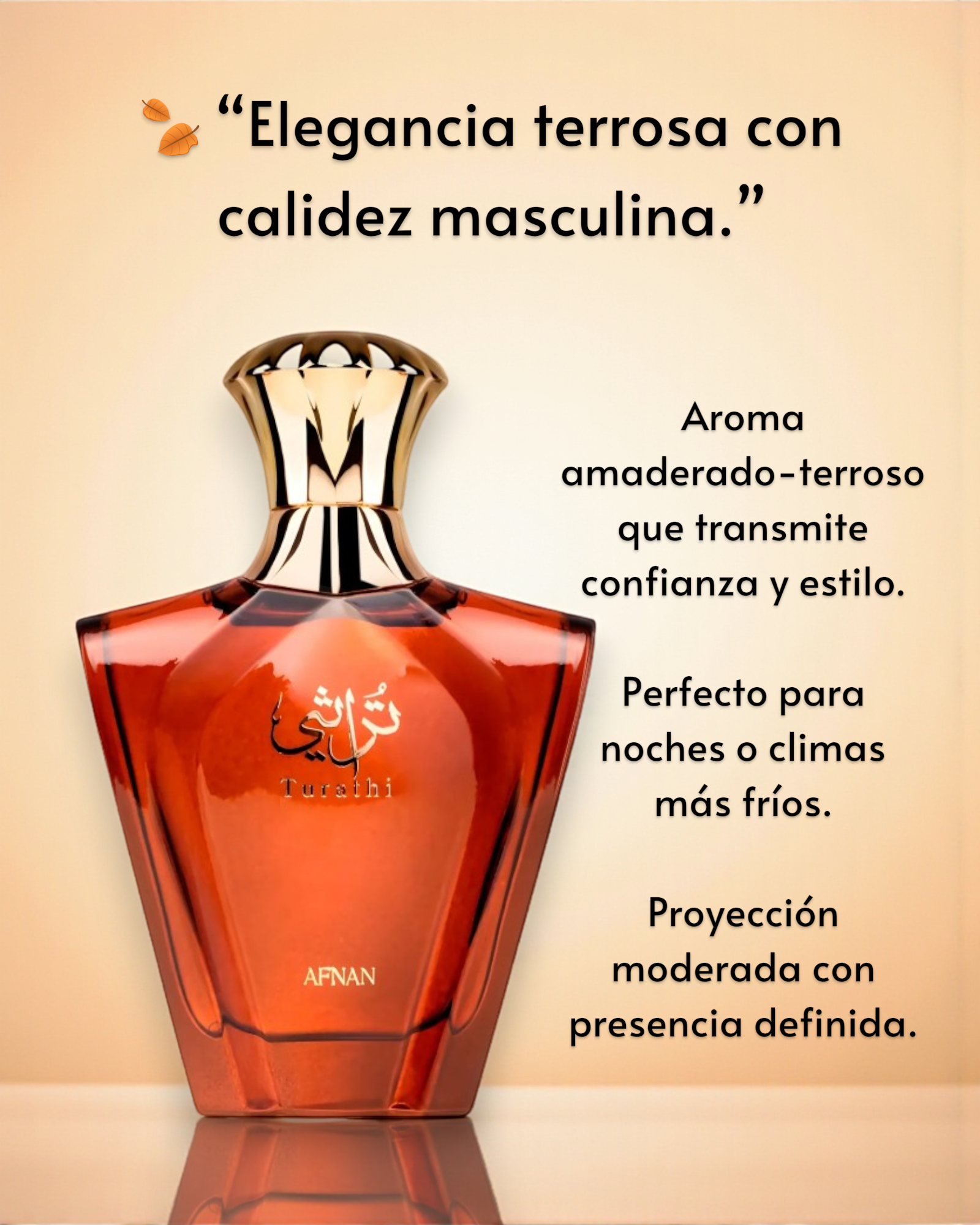 Turathi Brown de Afnan es una fragancia que exuda sofisticación y carácter. Su combinación de ámbar y pachulí, envuelta en especias cálidas, crea un aroma intenso y envolvente, perfecto para quienes buscan destacar con una presencia elegante y varonil. Su fondo de vainilla le añade un toque sutilmente dulce, equilibrando su fuerza especiada.